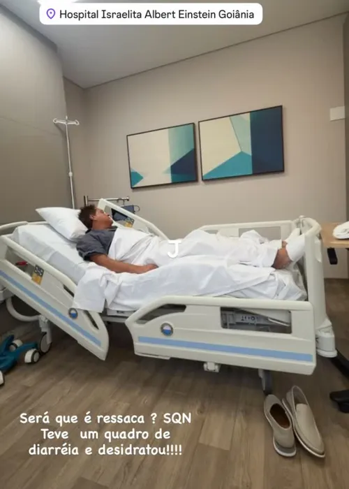 Em suas redes sociais, Poliana publicou uma foto do artista deitado em uma cama e explicou que ele recebeu diagnóstico de desidratação. Segundo ela, o problema teve início após episódios de diarreia. “Será que é ressaca? Só que não. Teve um quadro de diarreia e desidratou!”, escreveu a influenciadora ao mostrar o marido visivelmente exausto no hospital.