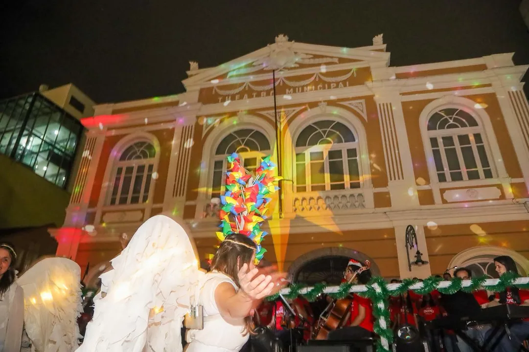 Entre projeções coloridas na fachada do teatro, Papai Noel de NitBike, rapel do Plaza Shopping e anjos em pernas de pau distribuindo cataventos, o público vivenciou uma noite mágica que encantou crianças e adultos.