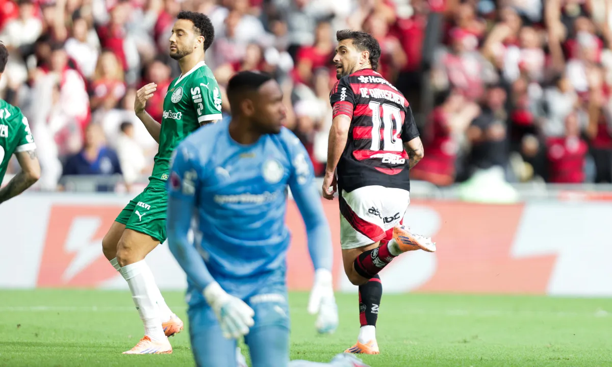Em ritmo acelerado, Arrascaeta marcou logo aos 9 minutos do primeiro tempo para o Rubro-Negro carioca de cara pro gol do adversário, após passe "açúcarado" de Pedro. Mas num descuido de não providenciar imediatamente a substituição de Léo Ortiz machucado, Vitor Roque empatou a partida de cabeça para o Palmeiras, aos 24.