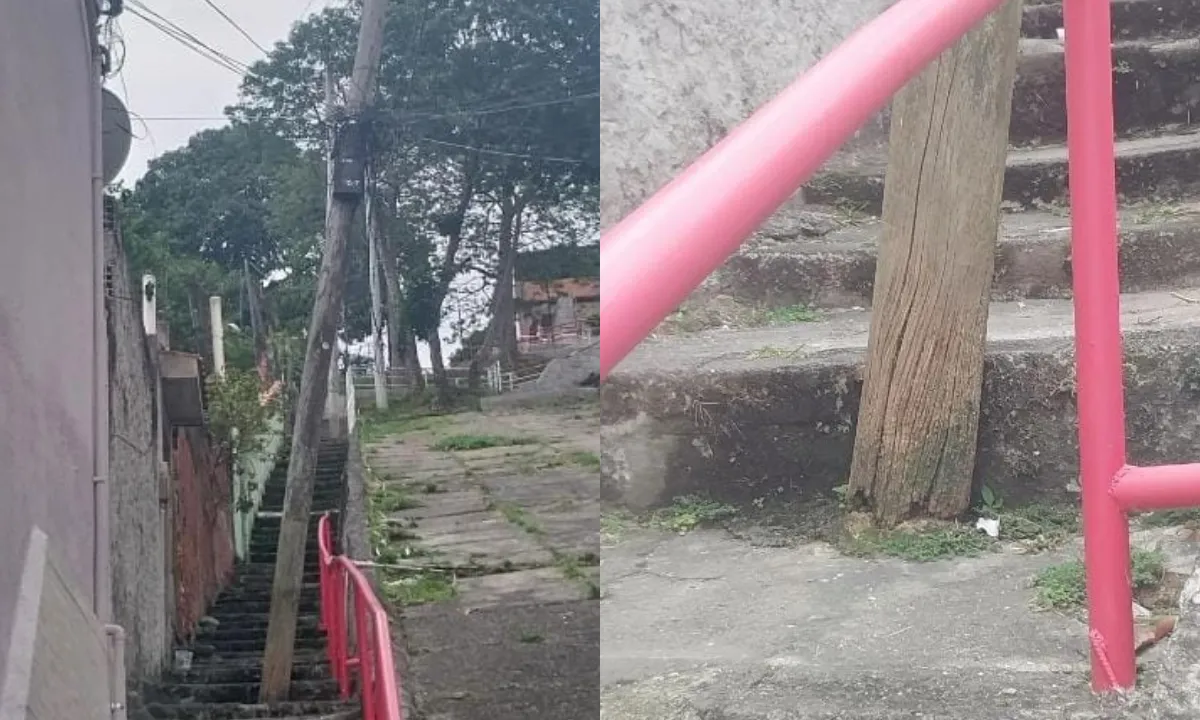 Segundo ela, o risco não se limita às casas. A rua é estreita, com escadaria usada diariamente por moradores mais velhos. “Aqui tem pessoas de 80 anos que descem a escada devagar. A gente passa correndo, com medo. Temos receio de alguém estar subindo e o poste cair dentro de uma casa ou em cima de alguém”, relata.