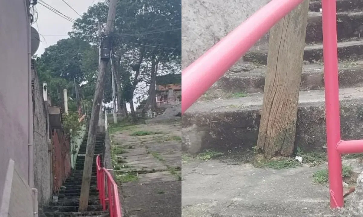 Além das residências, a preocupação envolve a circulação de pedestres. A via é estreita e conta com uma escadaria utilizada diariamente por moradores mais velhos. “Há idosos que descem com dificuldade. As pessoas passam com medo, receosas de que o poste caia sobre alguém ou dentro de uma casa”, relata.