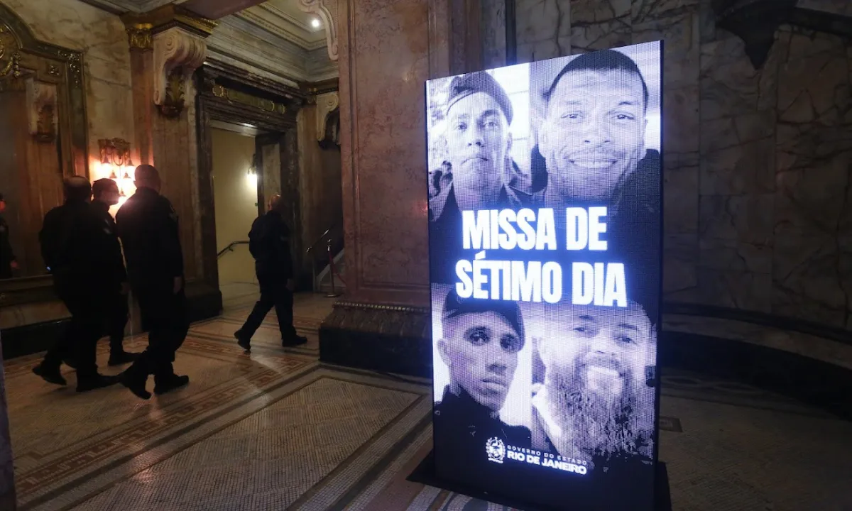 Uma missa de sétimo dia em memória dos quatro agentes de segurança pública que perderam a vida durante a operação Contenção nos complexos da Penha e do Alemão foi realizada, na noite desta quinta-feira (6), no Theatro Municipal, no Centro do Rio. A cerimônia reuniu autoridades estaduais, familiares, representantes das forças de segurança e centenas de pessoas.