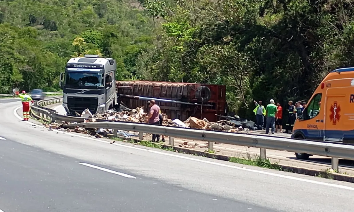 Caminhão com carga de sucata tomba na Serra e interdita BR-040