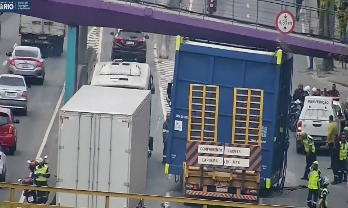 Uma carreta colidiu com a passarela 5 e causa interdições na Avenida Brasil, no Rio. Segundo o Centro de Operações e Resiliência da Prefeitura do Rio (COR-Rio), uma faixa da pista lateral em Benfica, no sentido Zona Oeste, está com interdições intermitentes para a retirada da carreta.
