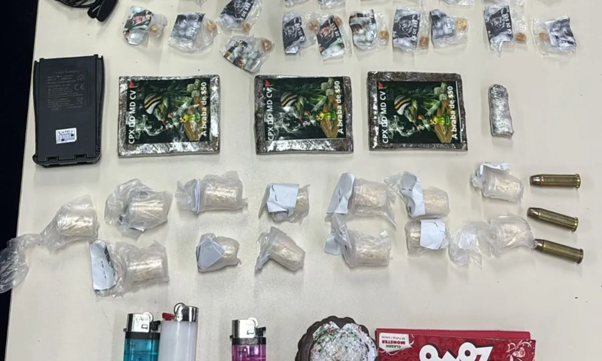 Com o suspeito os agentes encontraram uma variedade de entorpecentes e materiais utilizados no tráfico. Entre os itens apreendidos estavam 20 pedras de crack, 13 pinos de cocaína, quatro invólucros de maconha, três munições calibre 38 mm, três isqueiros, um triturador de maconha, um fone e uma bateria de radiotransmissor.