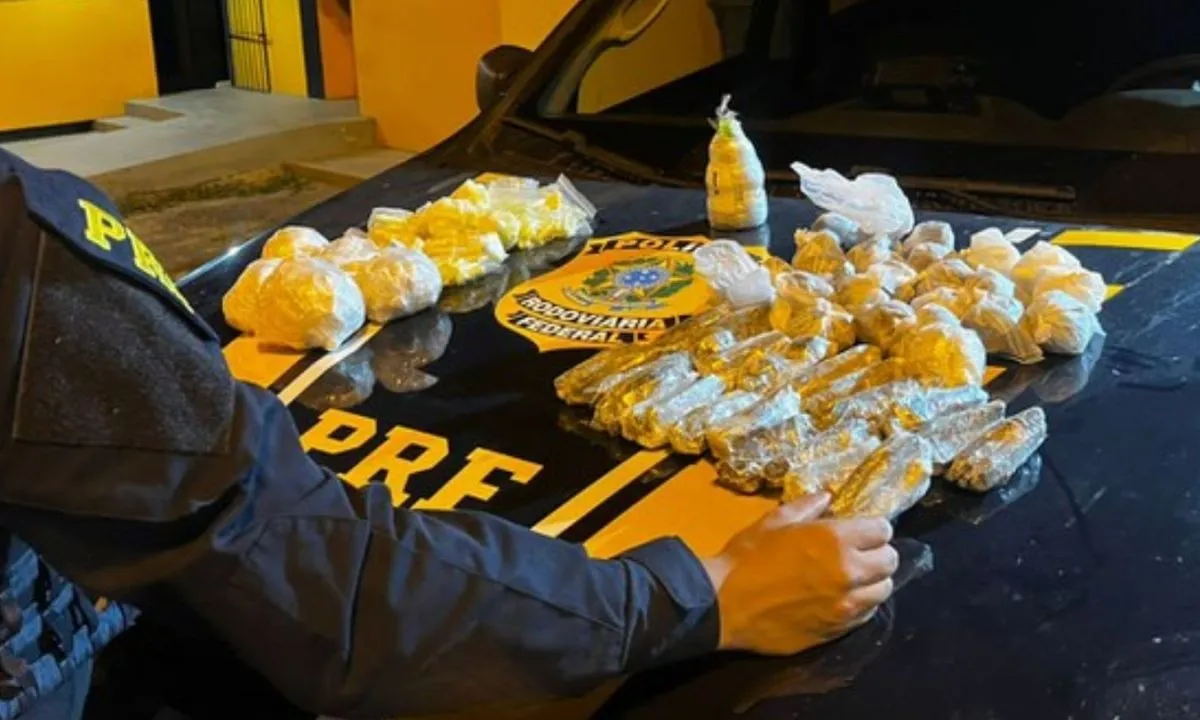 Ainda segundo a PRF, durante a revista, os agentes identificaram uma mochila vermelha com forte odor, que estava no bagageiro do ônibus. Na abordagem, foram encontrados mais de 1.000 pinos de cocaína, 420 porções de maconha, três pinos de haxixe, dois de ICE (droga sintética) e uma granada de fabricação artesanal.