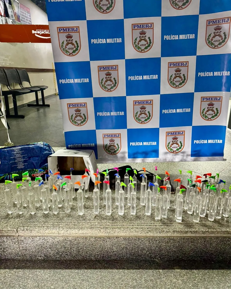 De acordo com a PM, por volta das 23h20, os agentes abordaram uma motocicleta Honda CG 125 vermelha. Durante a revista, o condutor foi flagrado transportando uma bolsa com 63 frascos de lança-perfume.